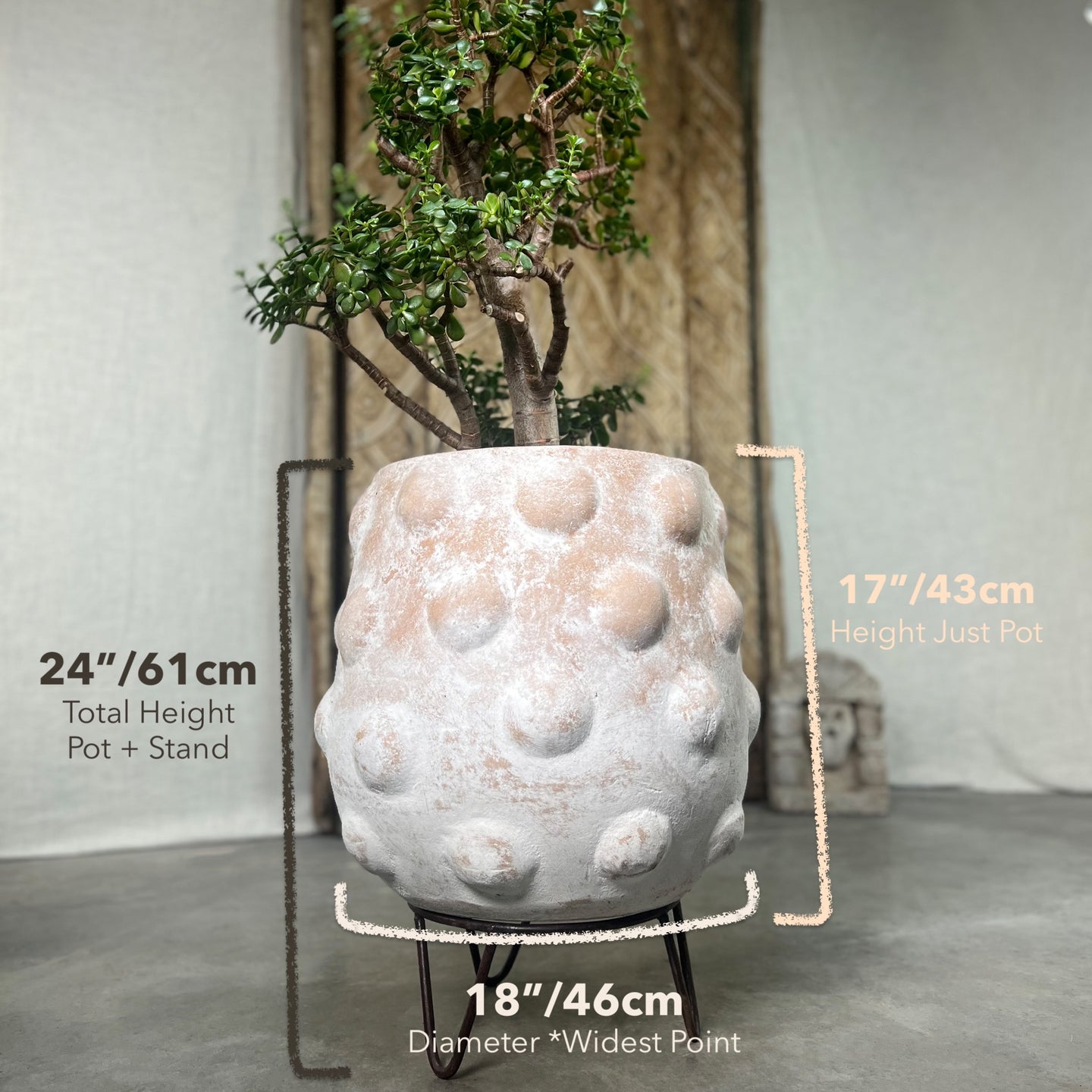 Blossom your flora in unparalleled style with the large Node Planter! Available either with solid wrought iron stand or just the terracotta pot. This large, handmade terracotta pot with is perfect for midsize to large plants and small trees. The Node's low-fire design is a blend of abstract and sophistication. The minimal cantaro shape is pronounced with large nodes; the raised 3"diameter nodes overlay the entire outer surface of the pot in an abstract pattern. The coarse terracotta surface is hand-painted with an ash white finish which compliments the muted terracotta color below. Elevate your plant game!