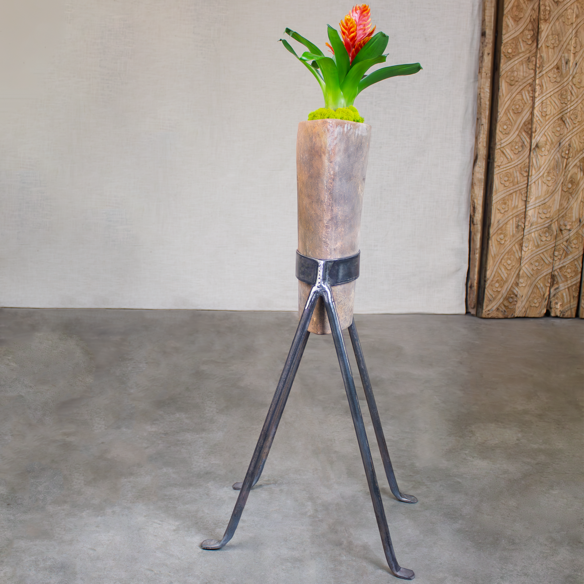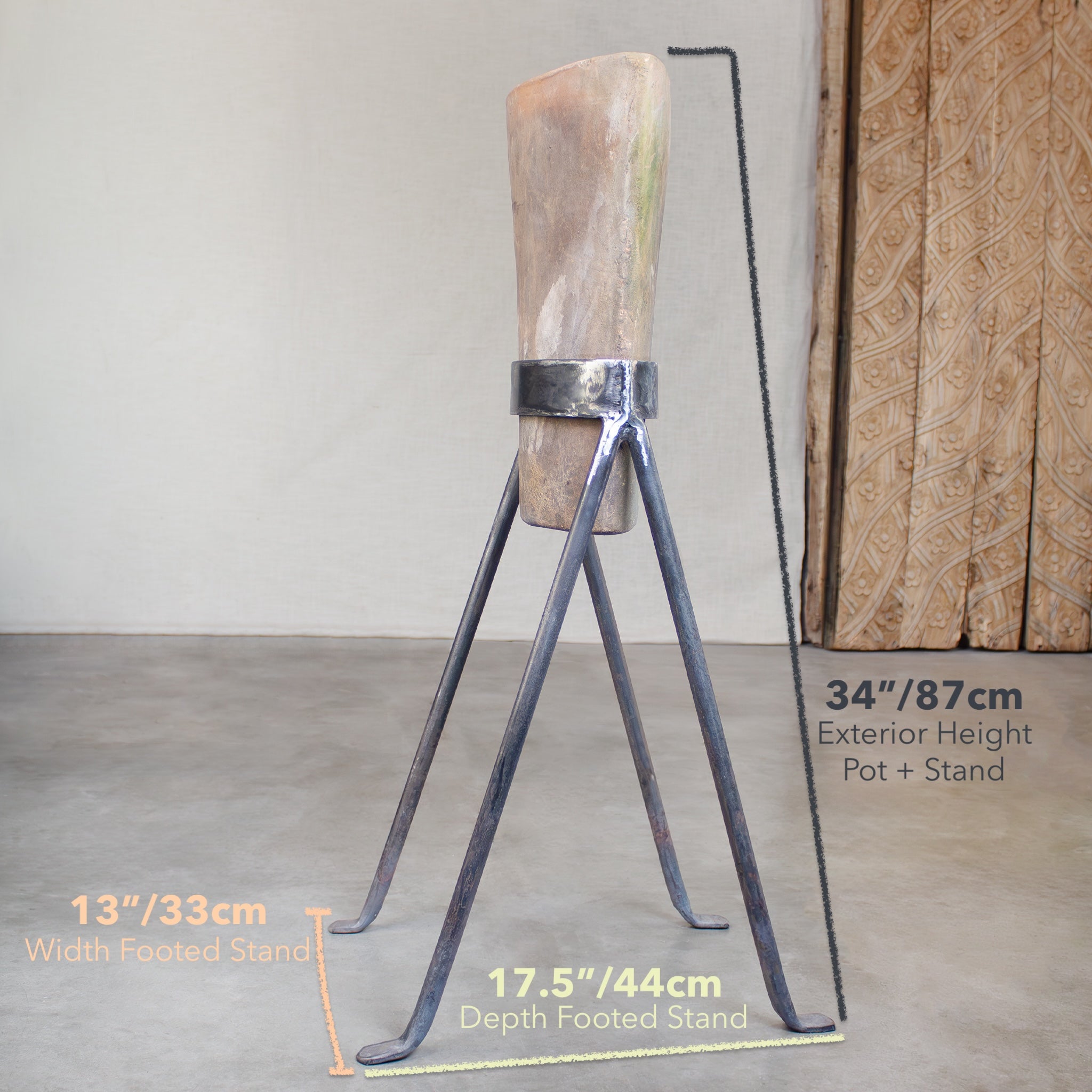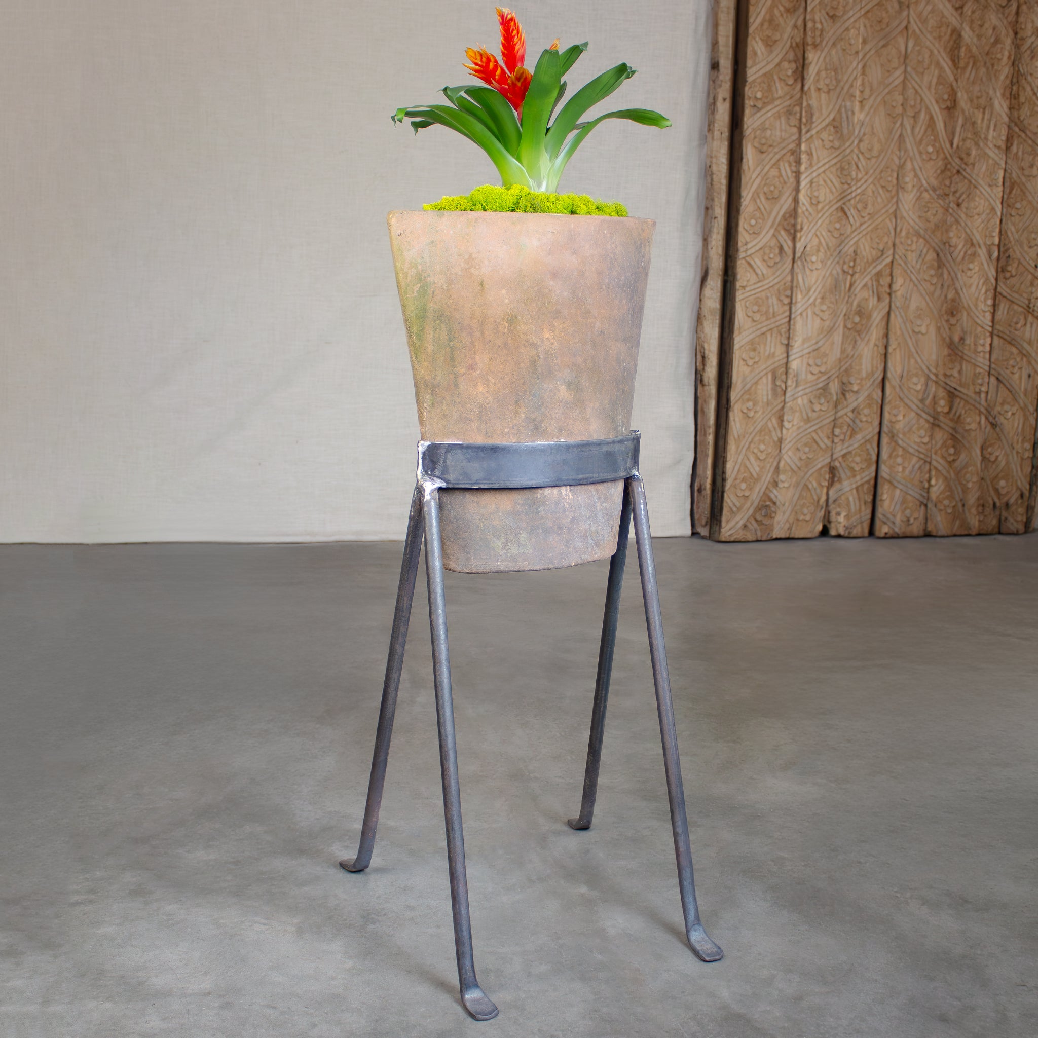 - Solid steel stand. 3/4"/2cm thick brushed steel industrial finish. Weight: 25Lbs/11Kg. The stand features feet that are hammered and shaped by hand. The elegant and minimal design compliments the orb shape mature pot. Each stand is individually handmade to mount and hold securely each vintage terracotta planter.
