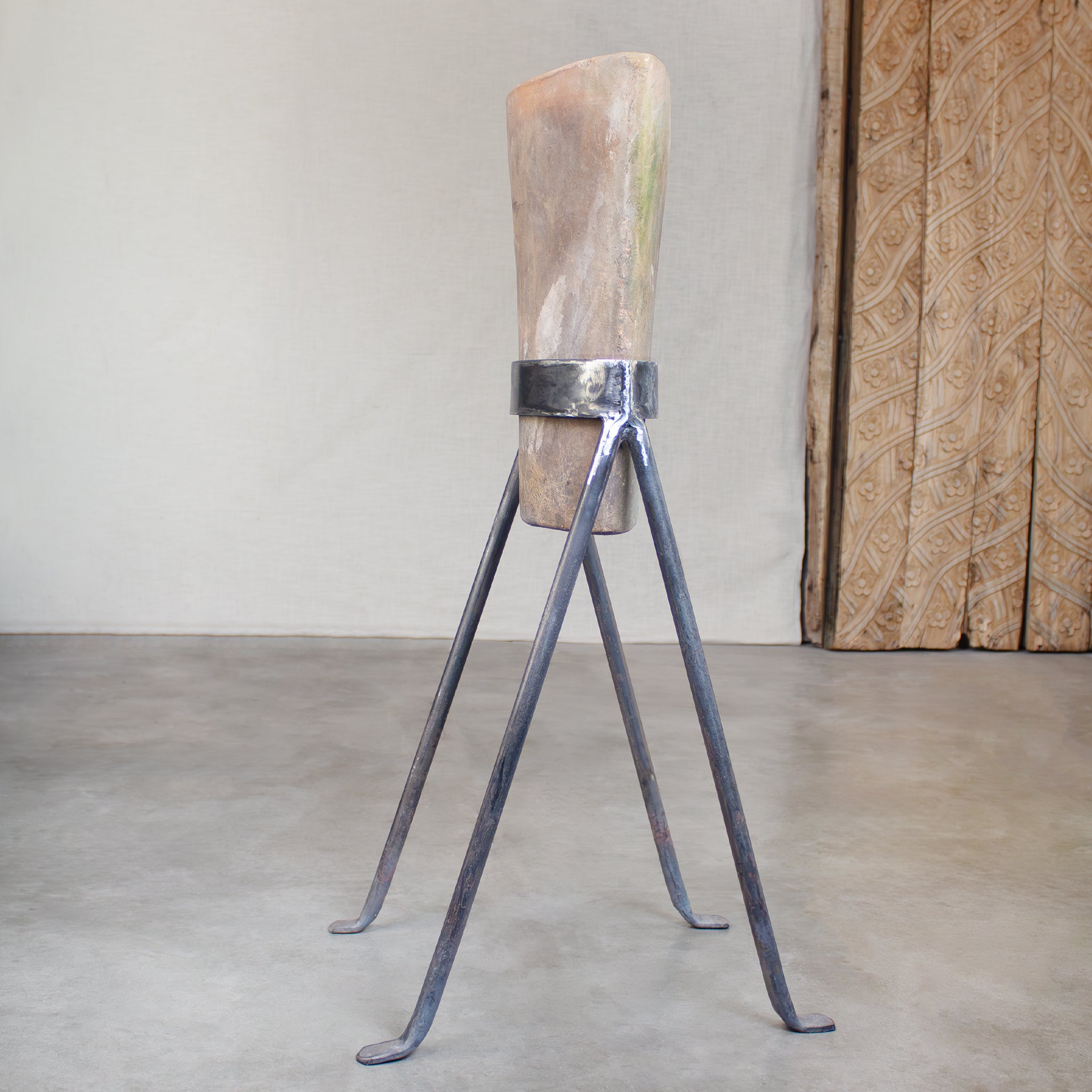 Sculptural terracotta planter rests in a Tall solid steel stand. Estimated age is over 60+ years, hand selected from a very limited of one-of-a-kind vintage terracotta vessels. Limited supply available. Includes heavy gauge steal stand with brushed industrial finish. To ensure stability and the perfect match, stands are individually handmade and hand-finished for each pot. The 3/4" thick brushed steel stand features feet that are hammered and shaped by hand; an elegant and minimal design complimenting the flowing organic shape of the terracotta pot. Decades of exposure to the elements, moisture and oxidization has transformed the terracotta's surface. Revealing an variegation of textures and earthen colors, shades of green from the natural moss that once grew over the terracotta; charcoal and slate grey to smokey beige. A horizon of natural color and texture varies around the entire surface and interior.