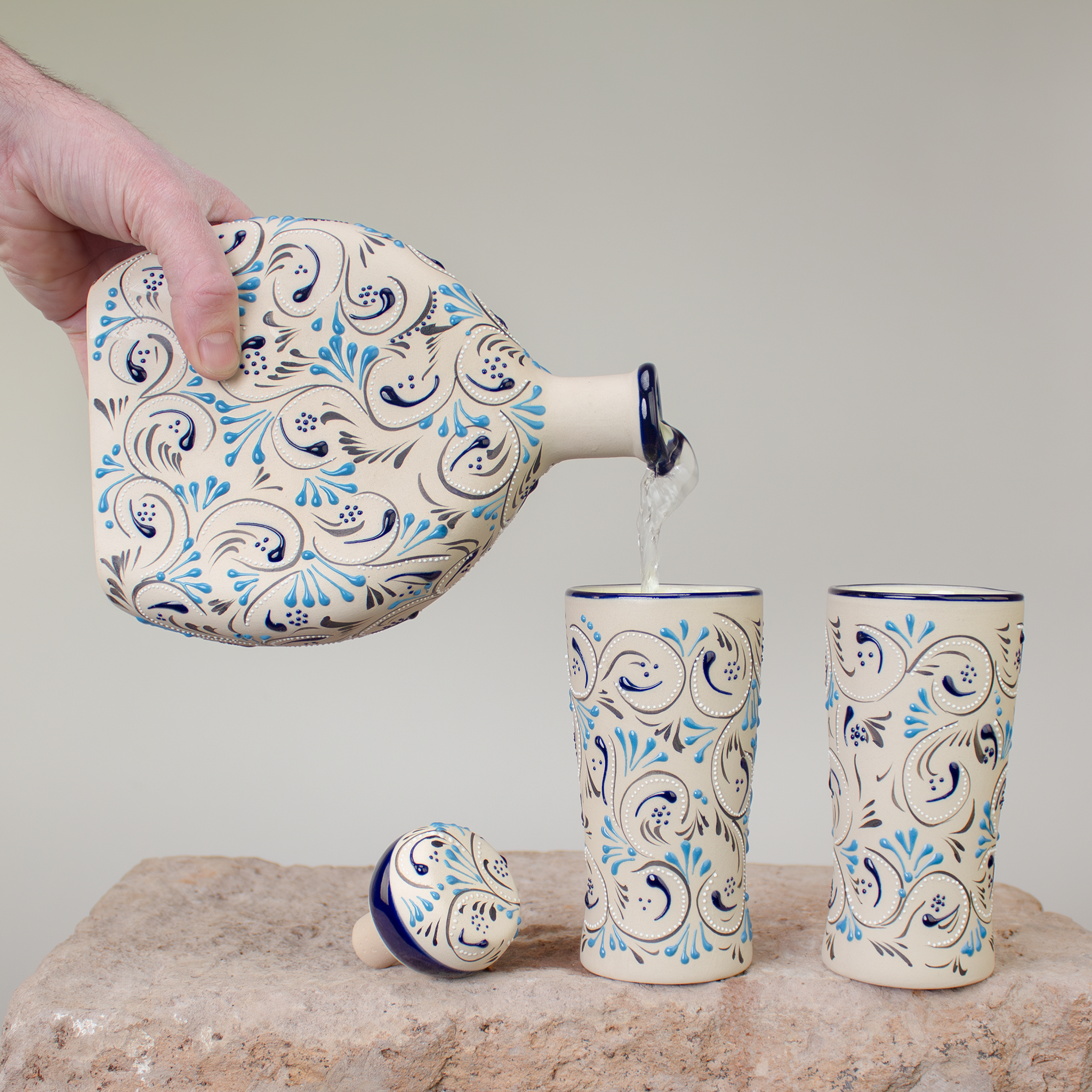 The stoneware decanters and shooters are twice baked in a high-fire kiln at temperatures reaching 1700˚F. This first bake transforming raw clay down to a molecular level the high heat and curing process forces out tiny air pockets condensing the material so that it is literally as hard as a rock, hence the name "stoneware". The Noir Edition stoneware has a dark graphite shade created by the specific compound of natural/raw clay and firing process.