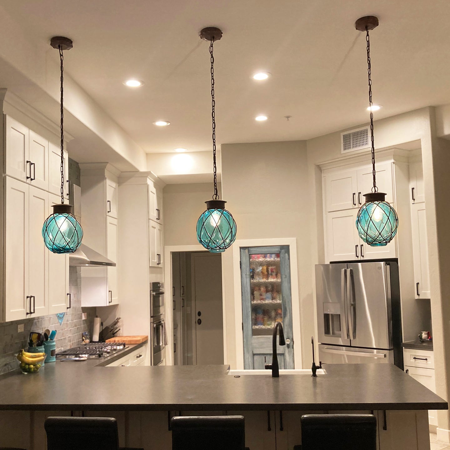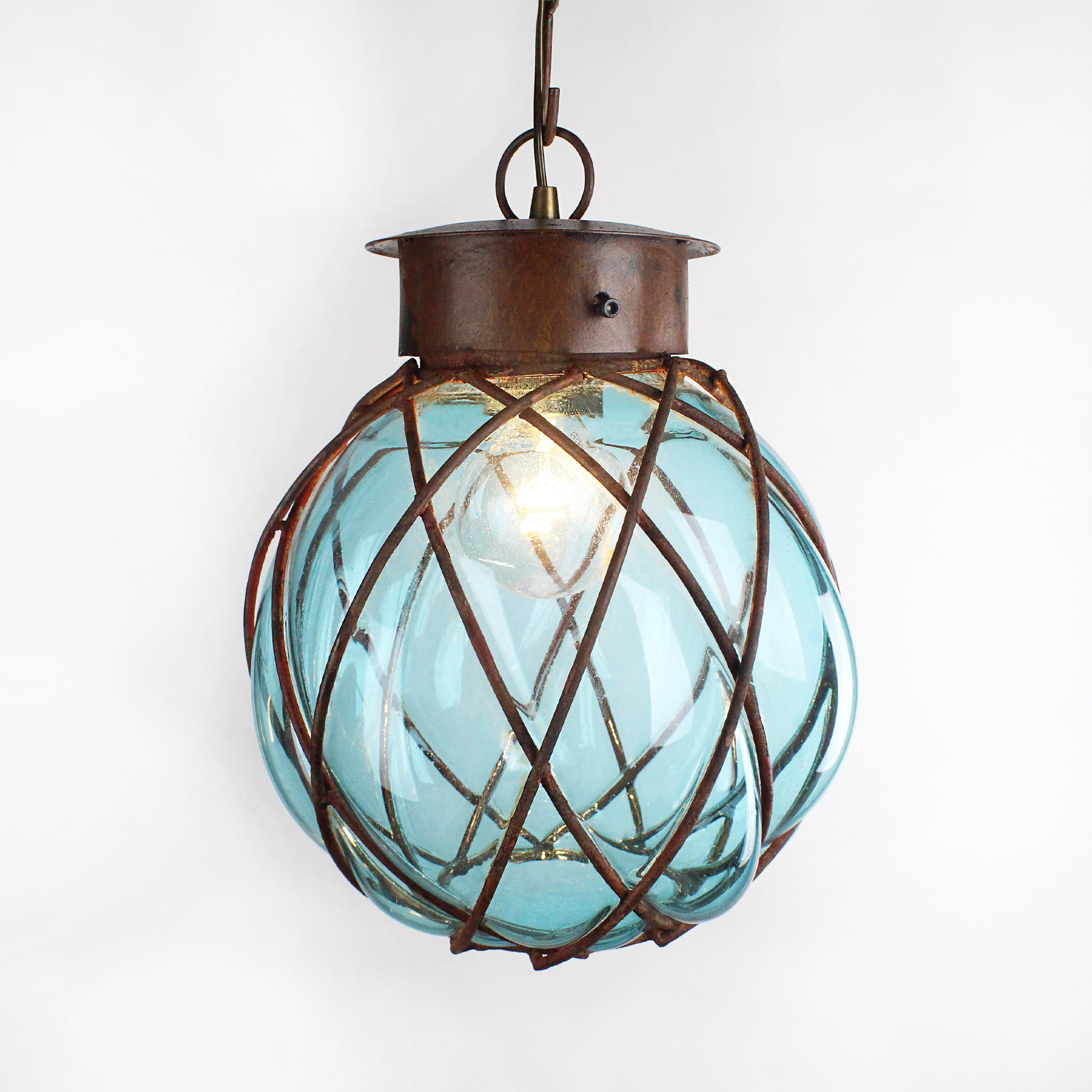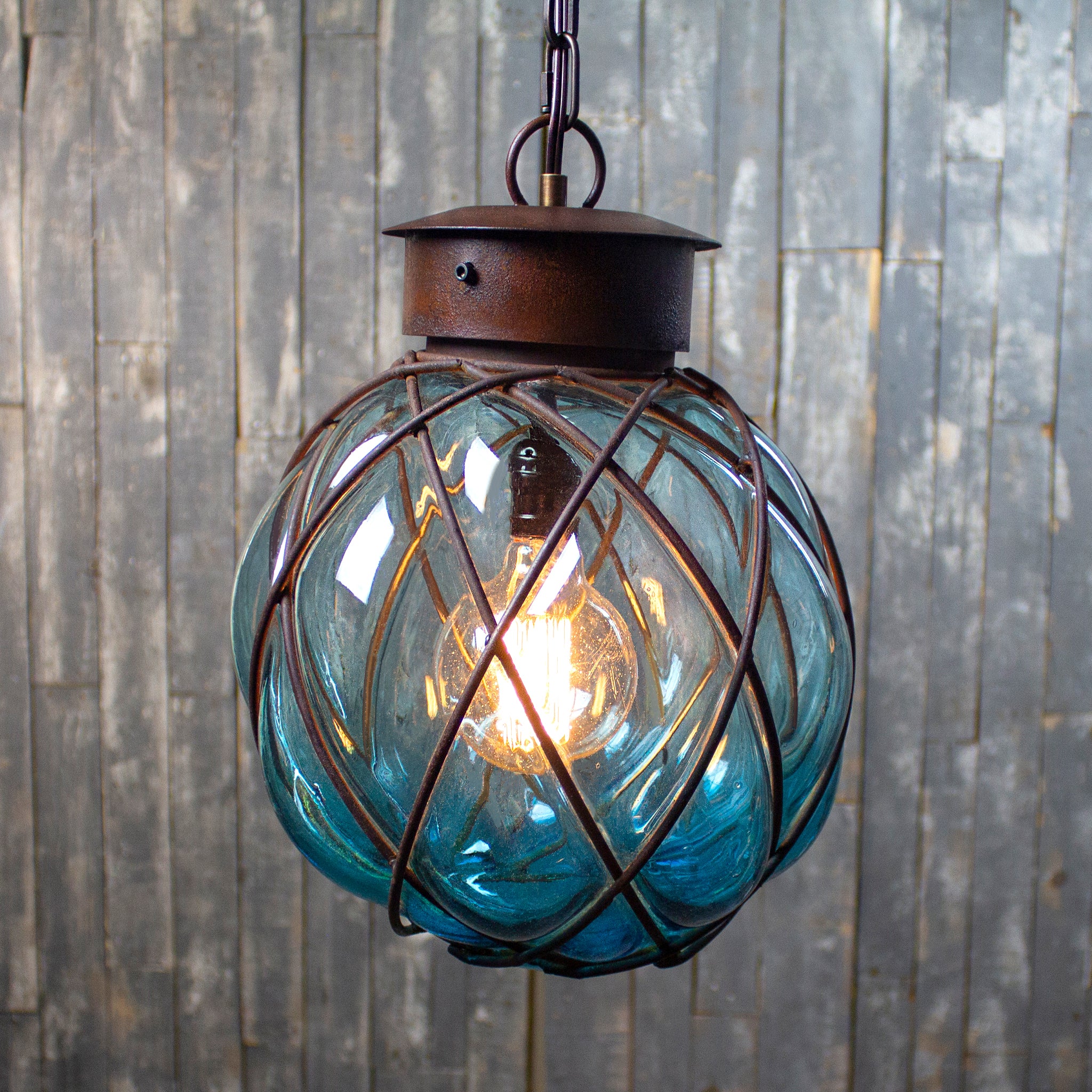 The Granada pendant light will be the center of attention in any home. The sphere shaped glass and iron pendent light has a unique costal style presence, these electrified pendants provide 360˚ degrees of illumination with no shortage of ambiance and style. Included with every Granada Pendant is our high-quality CSE / UL electrical component kit along with brass and solid iron decorative mounting hardware. This beautiful pendant light is created by a union of master ironwork & artisan glass blowing. Also available in Clear and other glass colors.